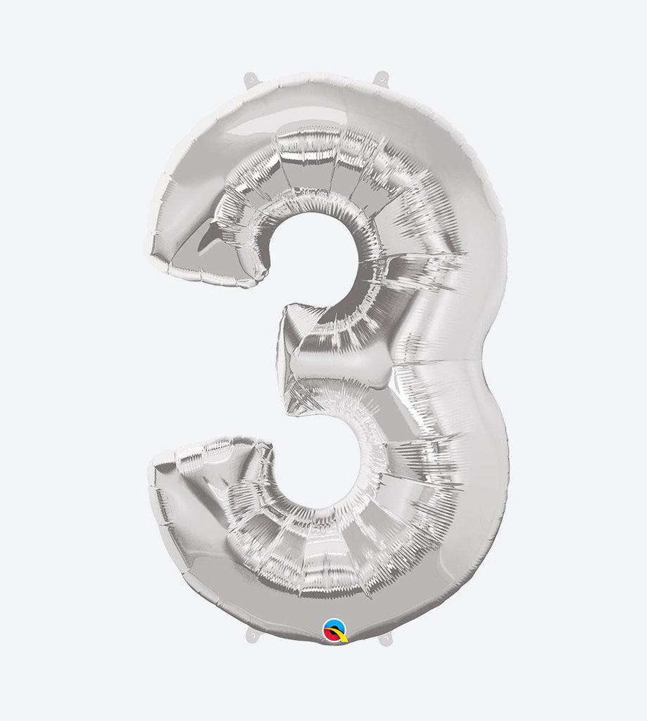 Globo de Número Tres, metalizado, 34 Plg, varios colores Diámetro inflado en pulgadas (centímetros): 30 X 27 (76 X 69) Capacidad de gas en pies cúbicos (metros cúbicos): 1.6 (0.045) Promedio # por 242 pies...